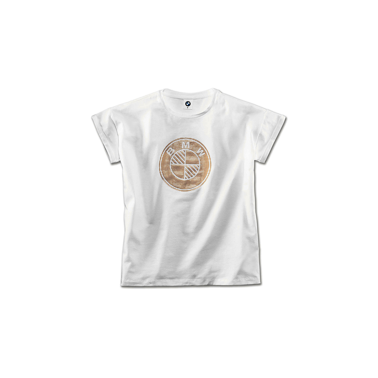 Póló homok színű, fényes BMW logóval. Mandzsetta ujja és leesett válla. Egyenes szabás és rövid vágás. Fém BMW logóval.