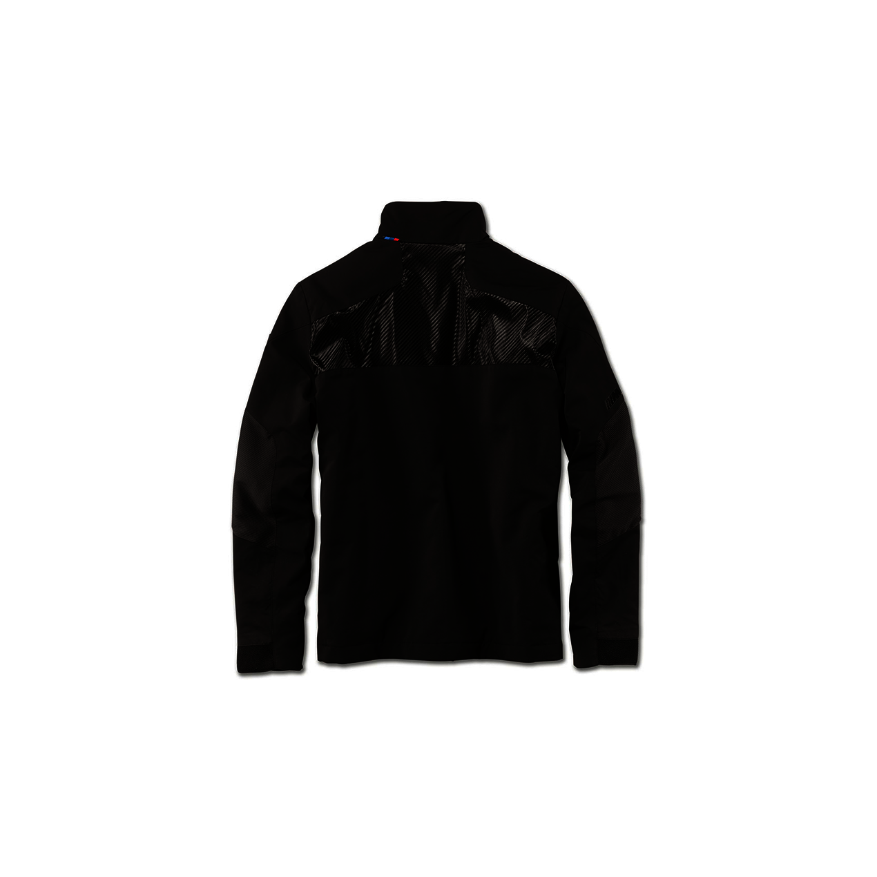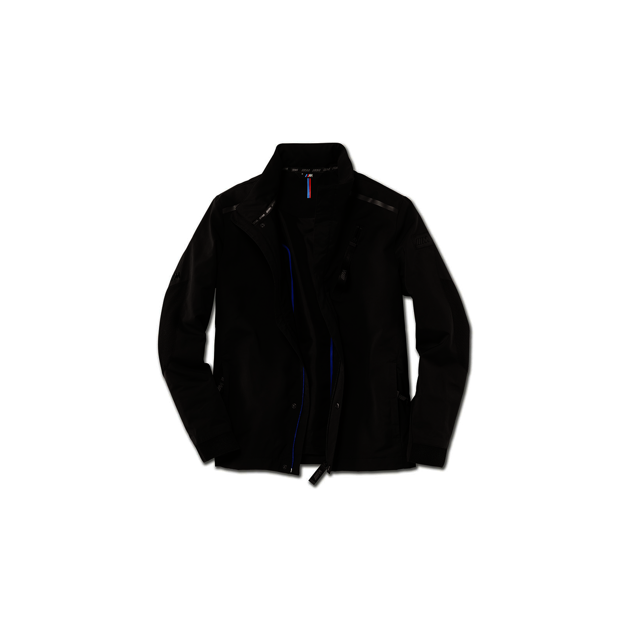 Sportos dzseki, anyagkeverékből. Álló gallérral, bordázott anyagú könyökbetétekkel és szénszálas megjelenéssel a vállon és a hátoldalon. Elől rövidebb, testre szabott illeszkedés. Kontraszt szín a cipzárral és a finom BMW M márkázással.