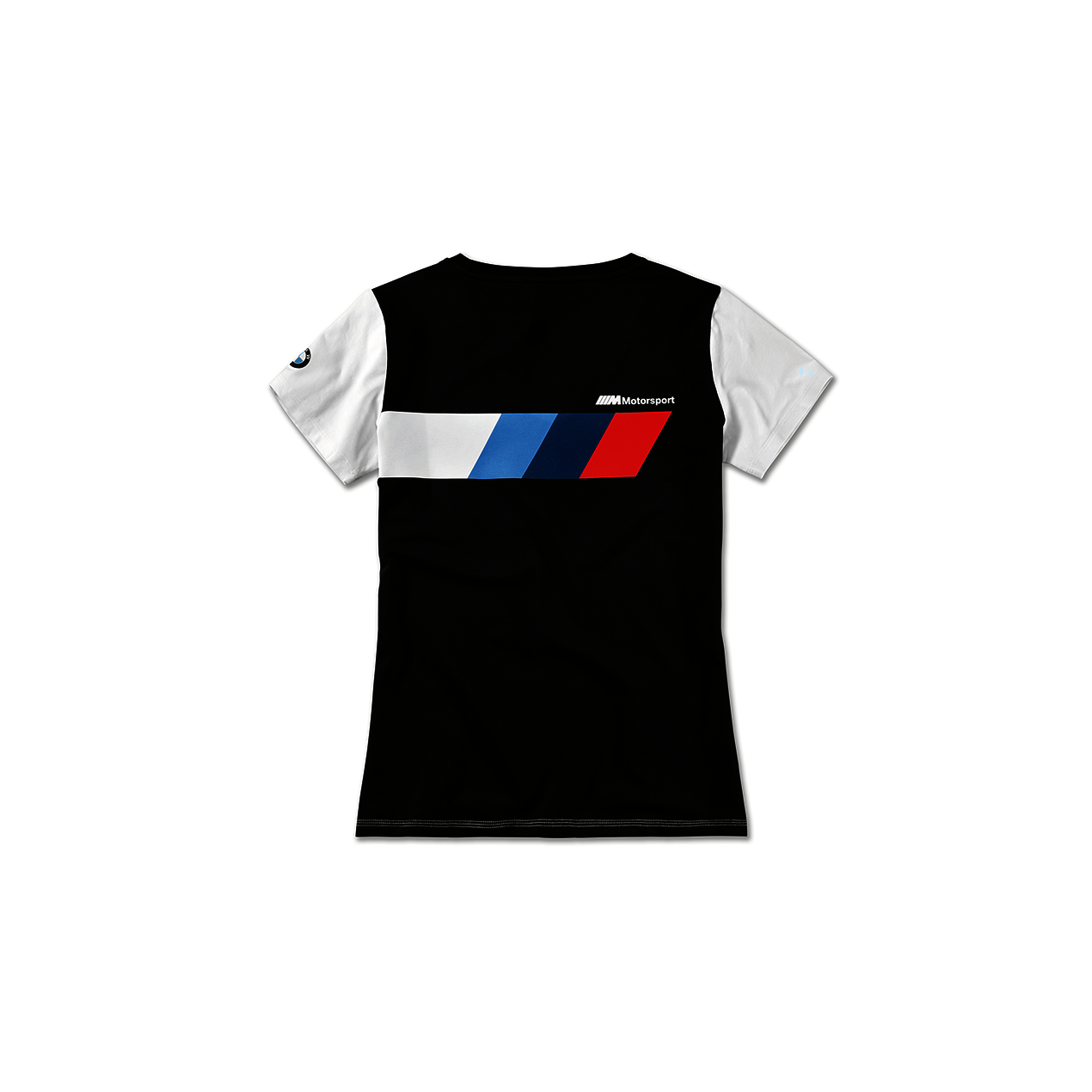 Fekete-fehér színű blokkoló póló. BMW M Motorsport logóval a mellkason és BMW M design csíkokkal a hátoldalon. Fekete V-nyakú kivágással.